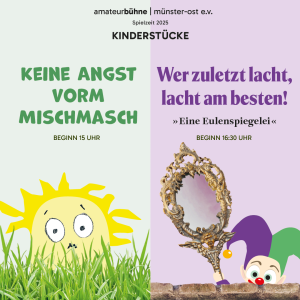 Das Kinder- und Jugendtheater 2025 findet in diesem Jahr am 28.06. und 29.06. sowie am 05.07. und 06.07. im St. Margareta-Pfarrheim, Hegerskamp 3, in Münster statt. Die Aufführungen beginnen jeweils um 15:00 Uhr (Keine Angst vorm Mischmasch), 16:30 Uhr (Wer zuletzt lacht, lacht am besten – eine Eulenspiegelei) sowie um 18:00 Uhr (Grenzenlos).